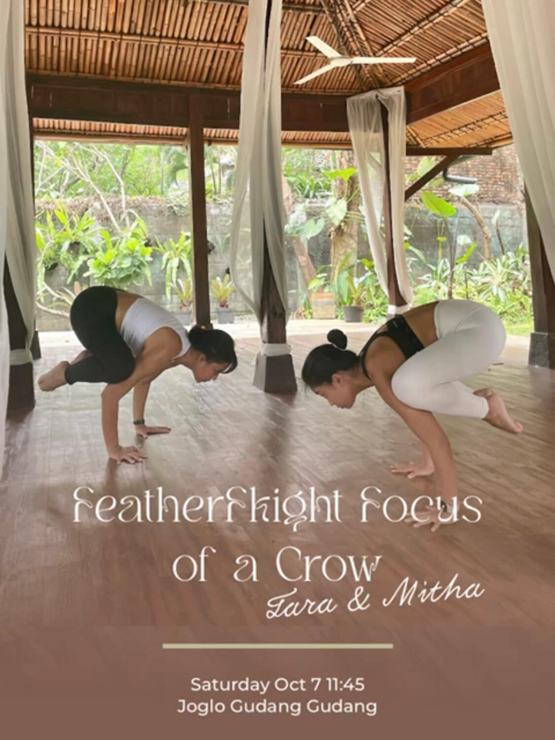 Traviata's teaching practicum 'Featherflight Focus of a Crow', a session spotlighting the artistry of Bakasana arm balances, reflecting her distinct yoga voyage