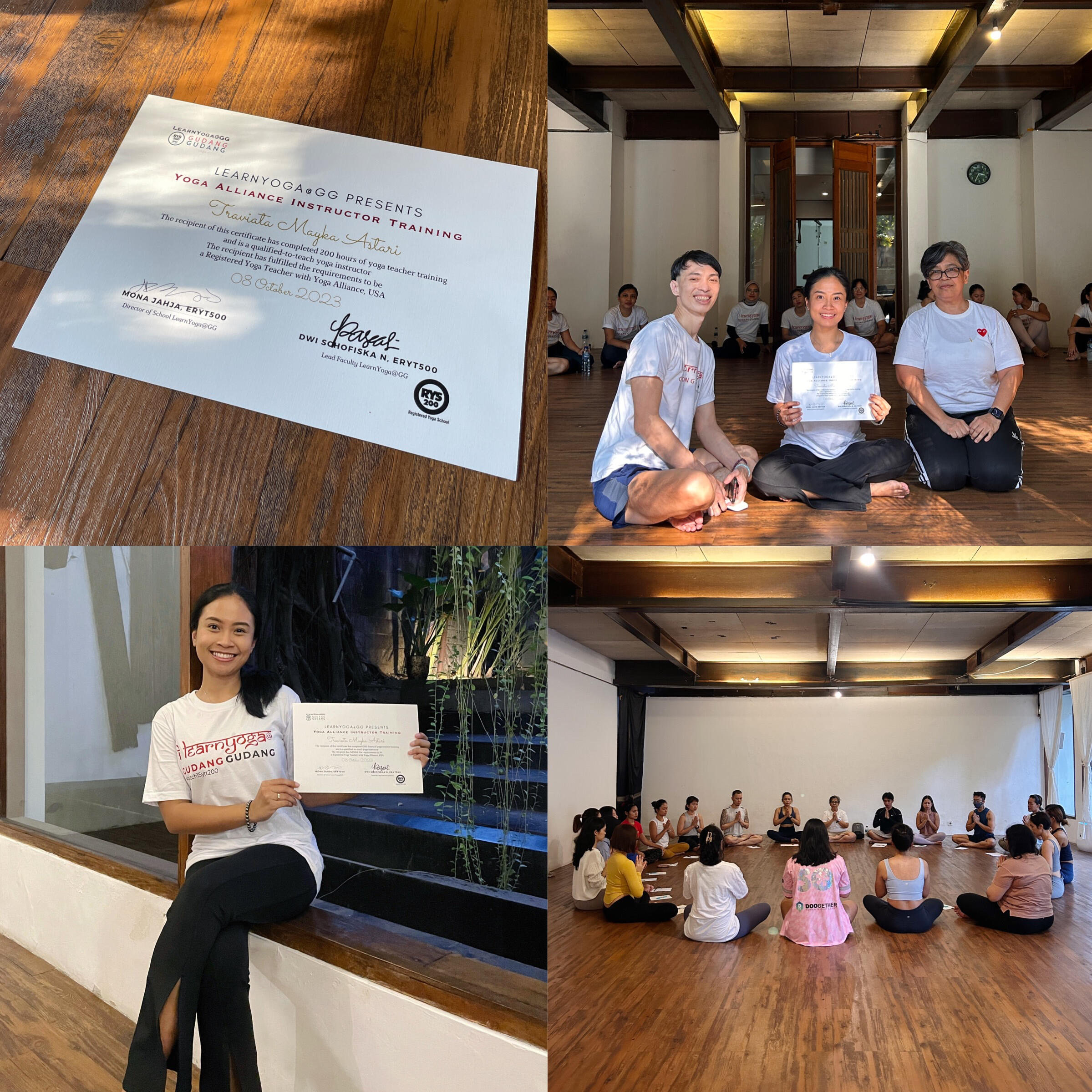 Certified through the rigorous 200-hour Yoga Teacher Training at Learn Yoga @ GudangGudang in 2023, Traviata developed strong foundational skills rooted in the B.K.S. Iyengar approach, emphasizing alignment, precision, and mindful practice. This training laid a solid groundwork for her evolving teaching journey.